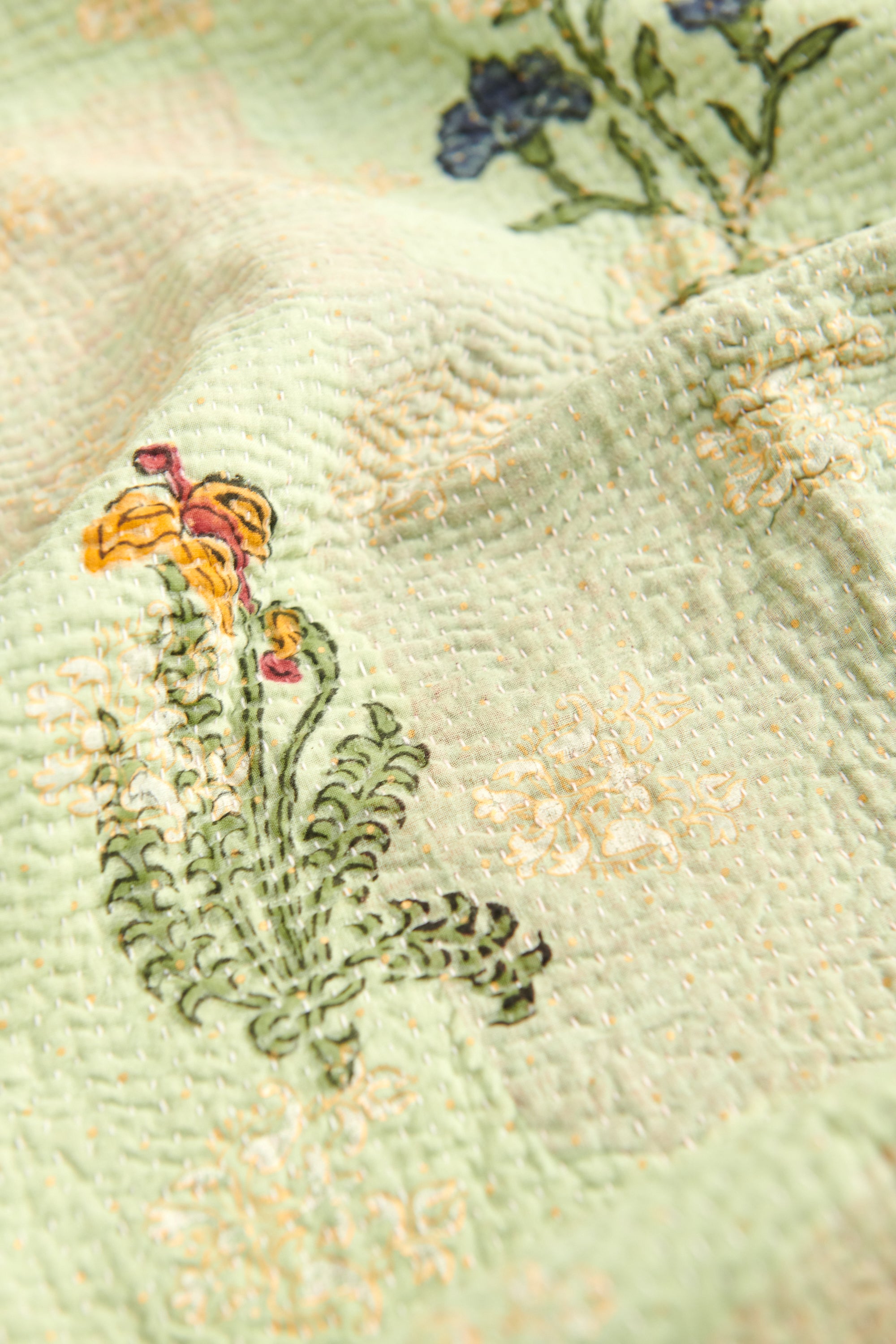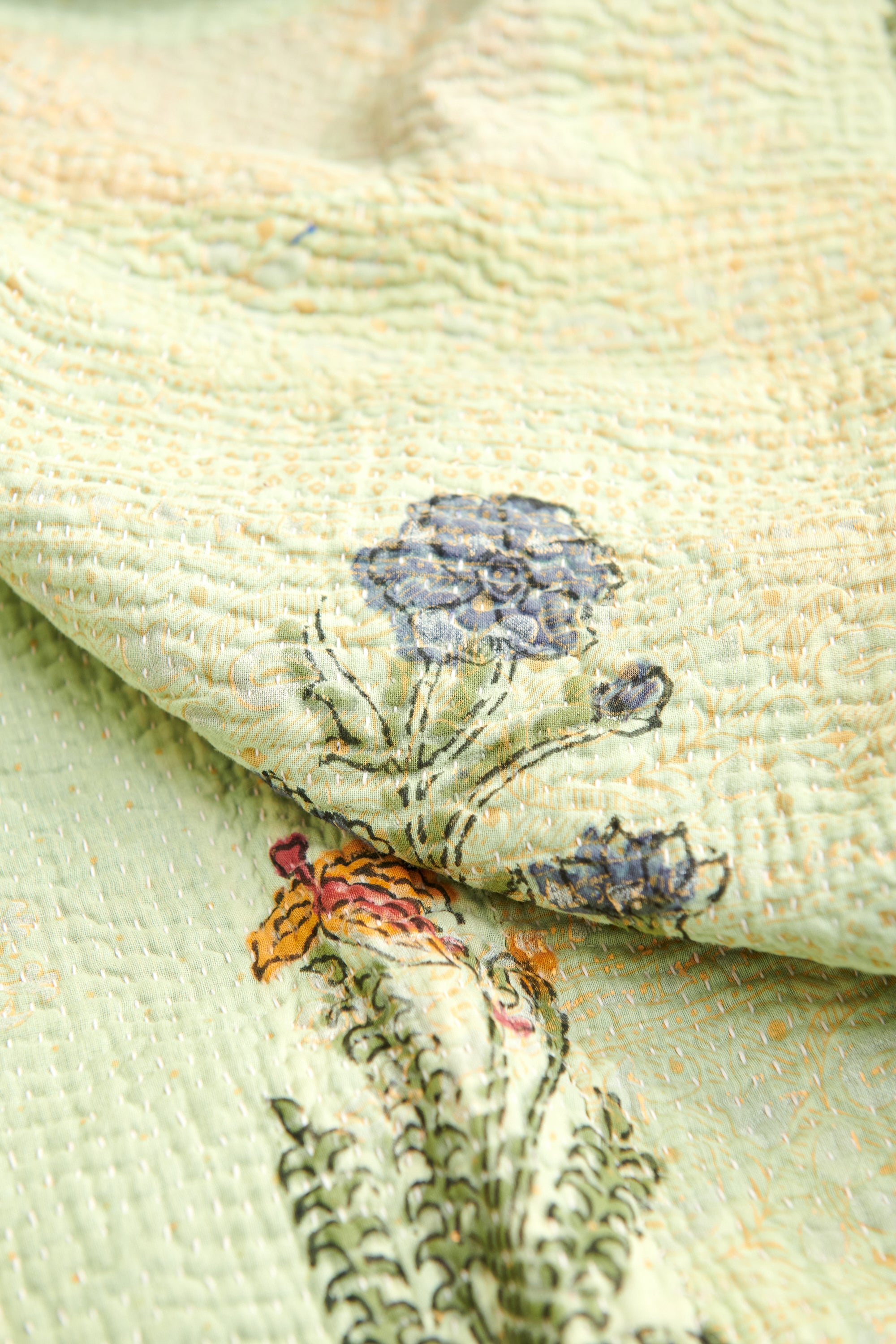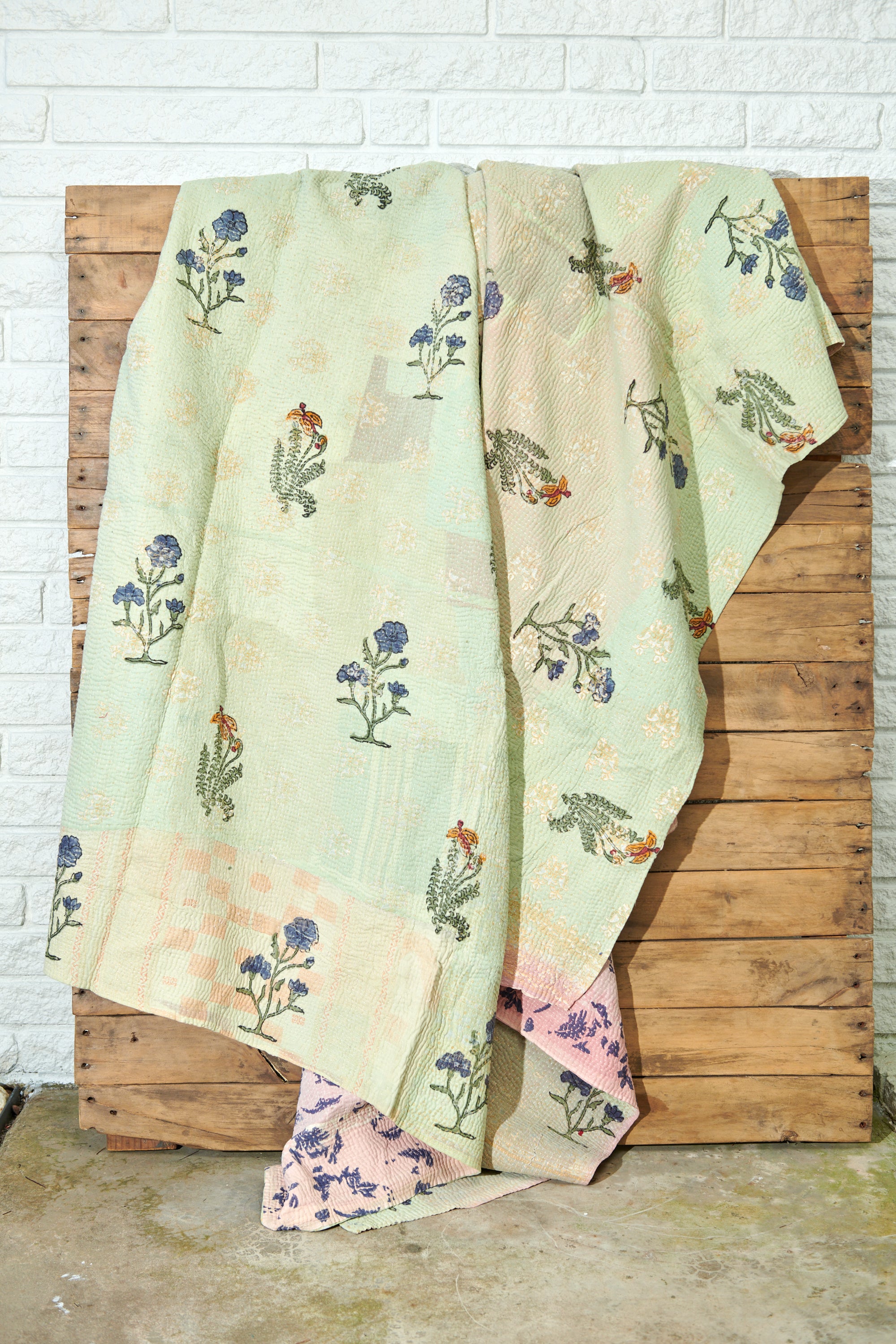 One of a kind blanket featuring hand block printed floral patterns layered over a kantha quilt crafted from vintage Indian textiles.