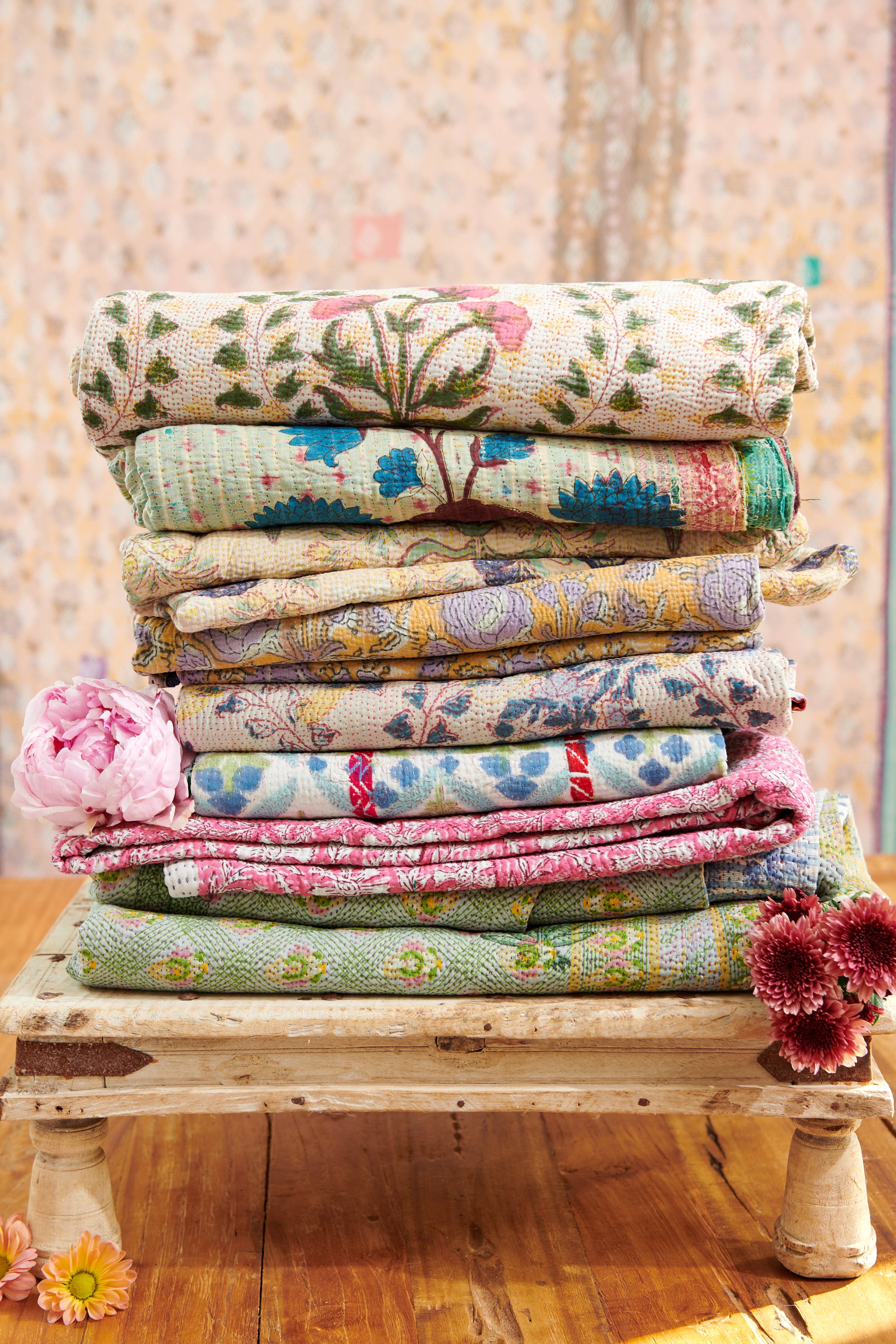 Please celebrate the vintage and handmade qualities of this artisan crafted product and allow for charming imperfections in the threadwork and lines. Each blanket is unique and may show signs of wear from its past life. Our kanthas are individually selected or commissioned, and sourced directly from small, family businesses and women-owned cooperatives in India.