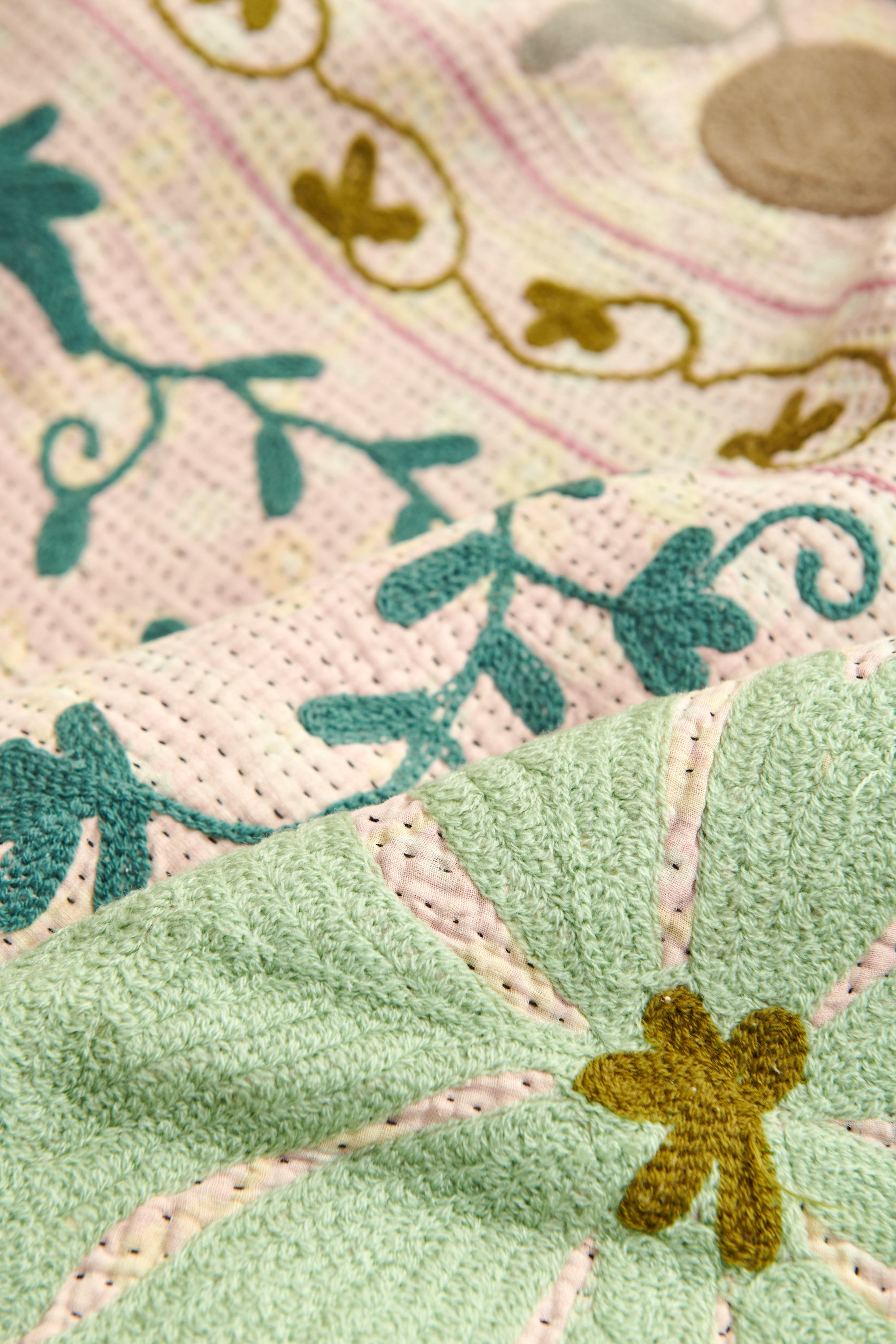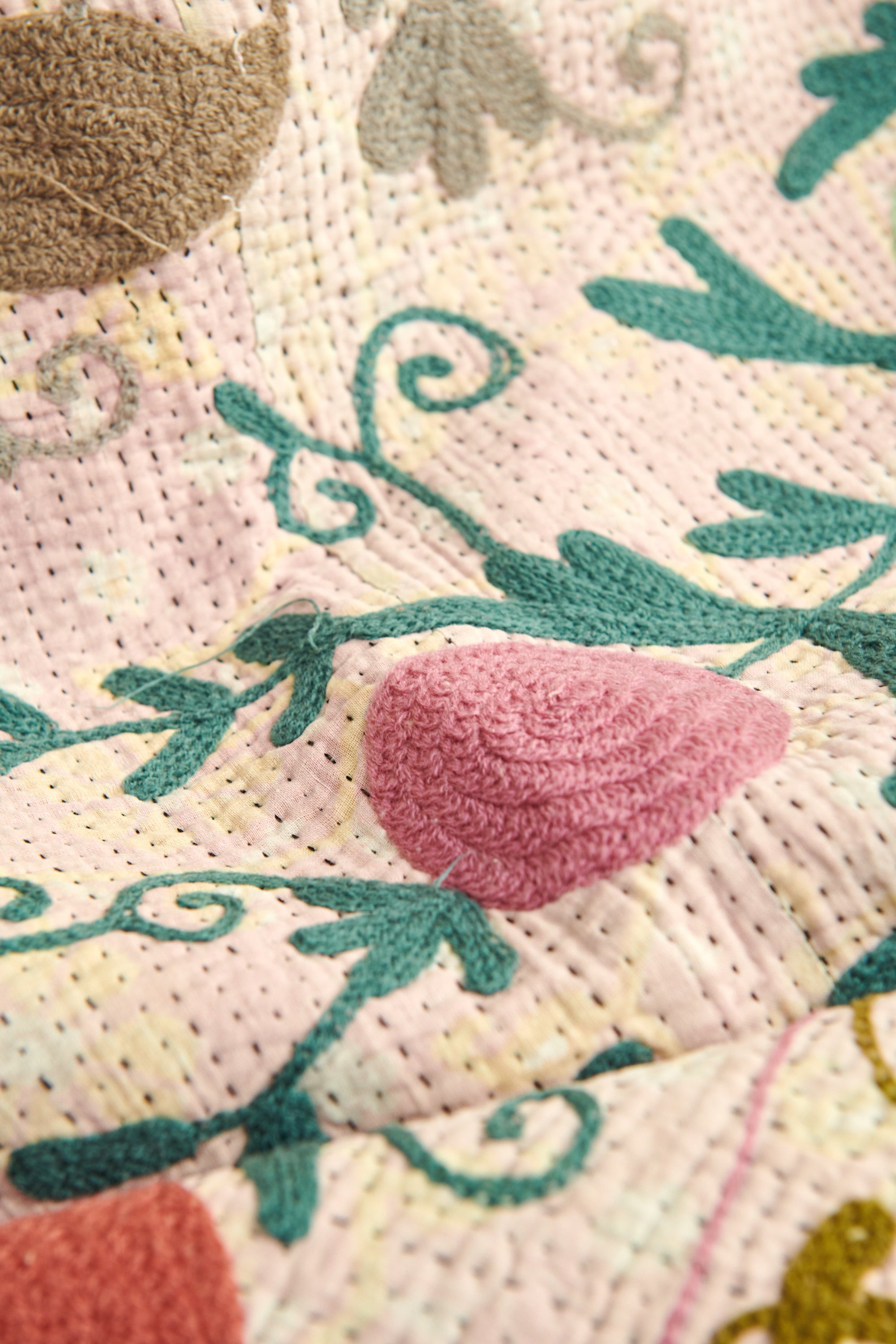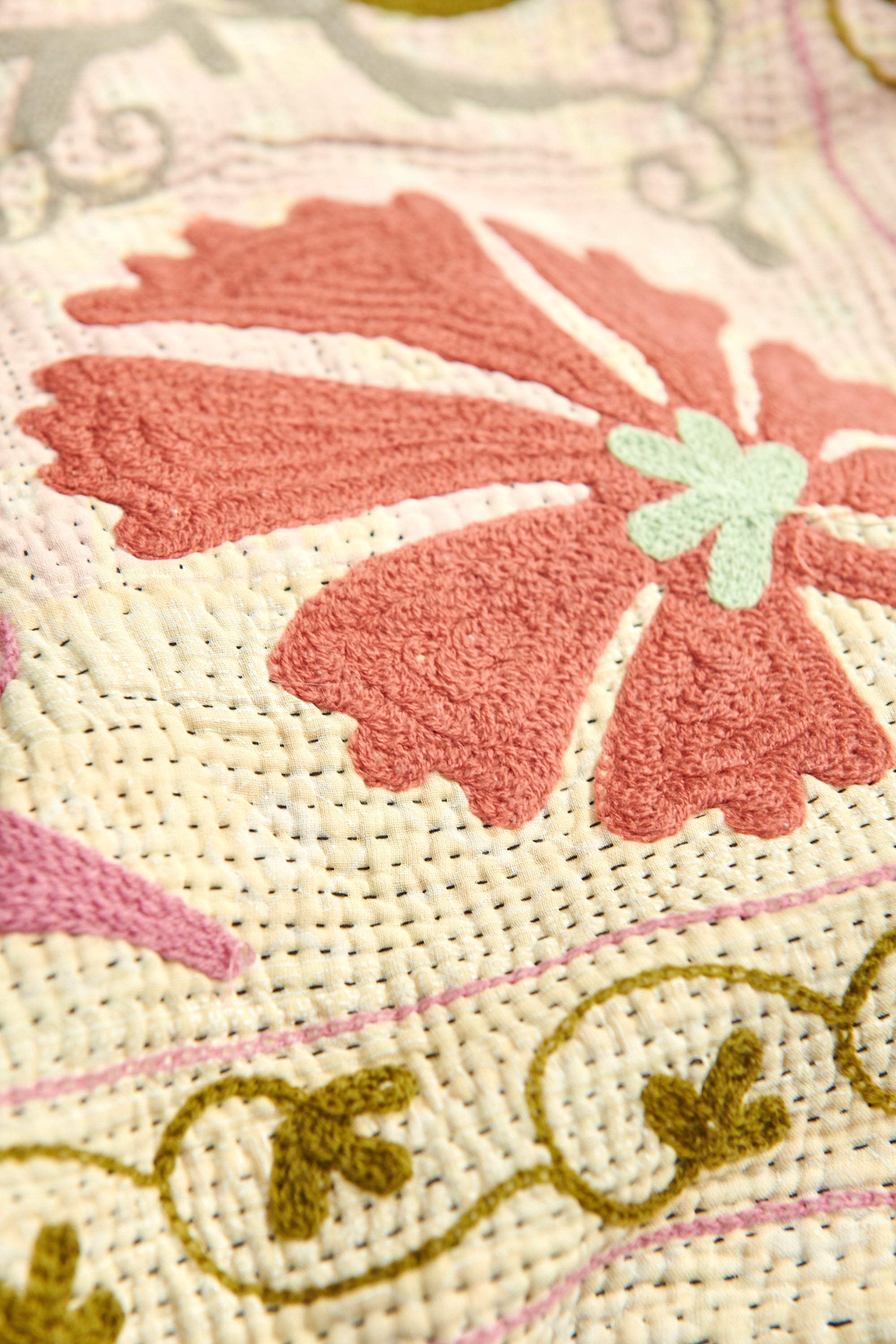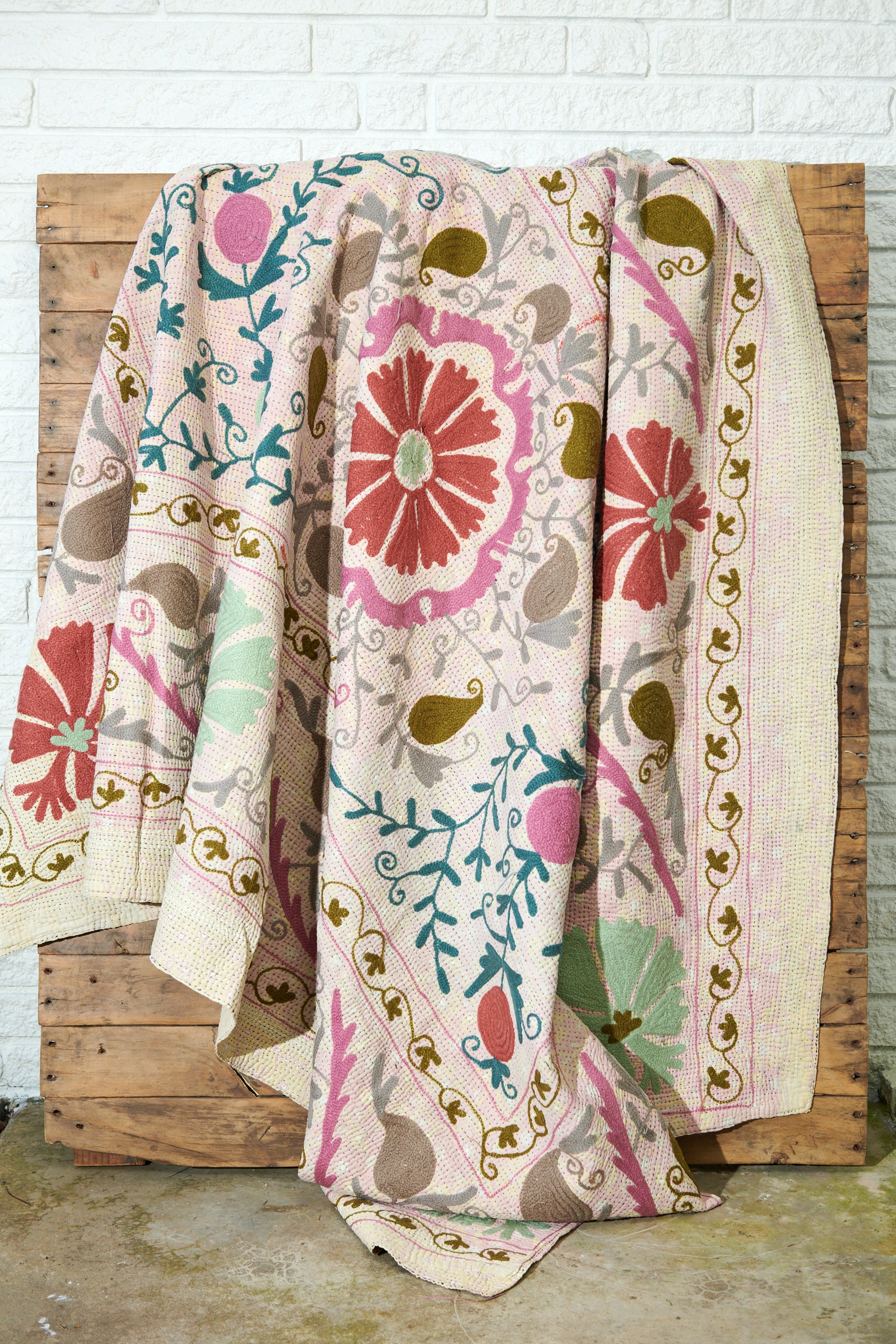 One of a kind blanket featuring blooming Suzani stitchwork over a layered kantha quilt crafted from vintage Indian textiles.